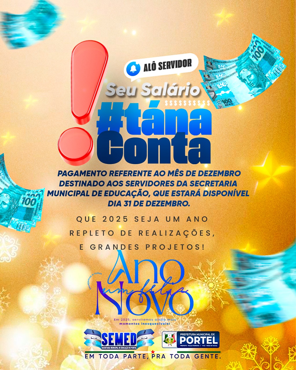 A Prefeitura de Portel informou que o pagamento do salário de dezembro para os servidores da educação e da administração pública estará disponível a partir de amanhã, dia 31 de dezembro. A medida demonstra o compromisso da gestão municipal com todos os trabalhadores, assegurando que possam encerrar o ano com tranquilidade financeira.